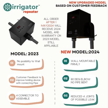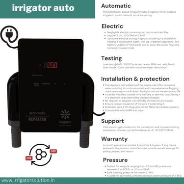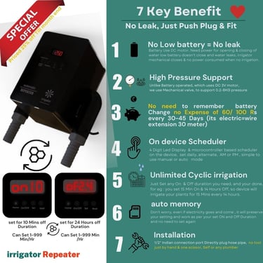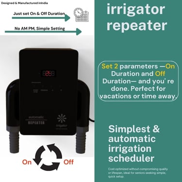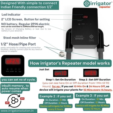 Introducing the "Irrigator Repeater" – a hassle-free solution for irrigation. Simply set the on and off duration, and you're done. No need for complex AM/PM or day settings. This user-friendly device offers efficient and automatic irrigation, perfect for your terrace or balcony.