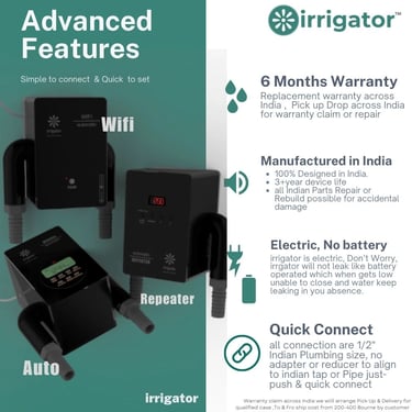 No Leak due to low Battery, its Electric 2 Pin, wire can be stretched upto 50meter/150 Feet : Take charge of your terrace and balcony plants with the Irrigator Manual. This user-friendly device allows you to set up to 12 irrigation schedules per day, providing unparalleled flexibility to cater to the unique needs of your plants.