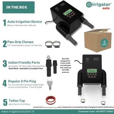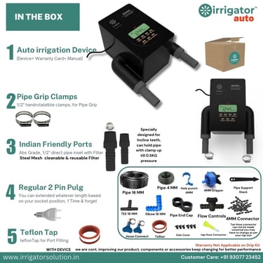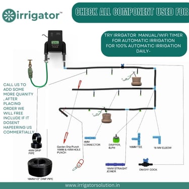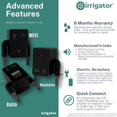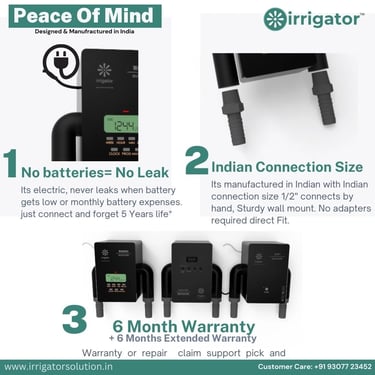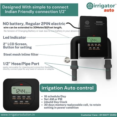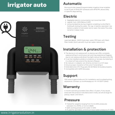 No Leak due to low Battery, its Electric 2 Pin, wire can be stretched upto 50meter/150 Feet : Take charge of your terrace and balcony plants with the Irrigator Manual. This user-friendly device allows you to set up to 12 irrigation schedules per day, providing unparalleled flexibility to cater to the unique needs of your plants.